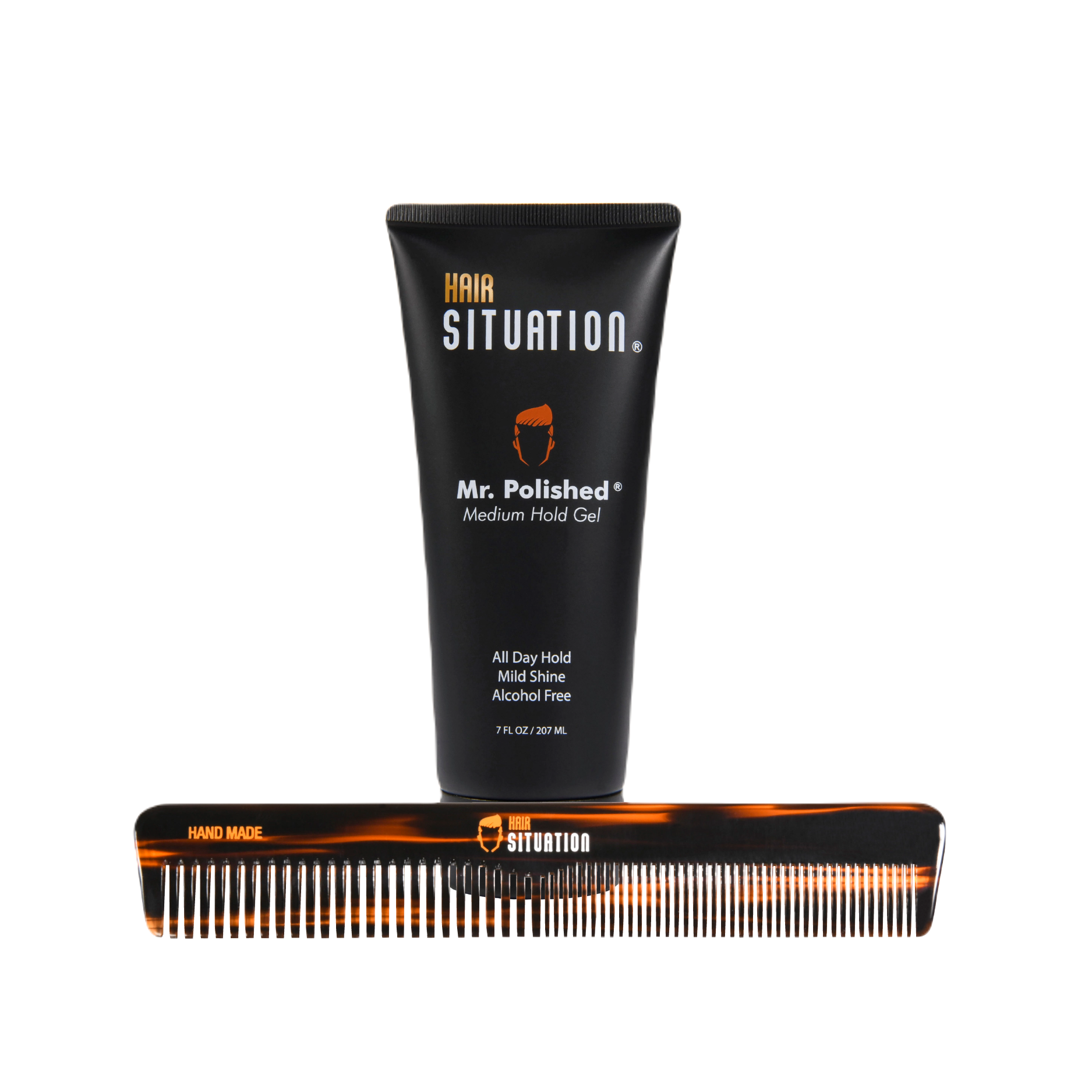 Mr. Polished Medium Hold Gel - Can control the most common hair situation. Our alcohol-free strong-hold formula keeps you looking polished all day long. Infuse your style with mild shine and enjoy the irresistible fresh masculine scent while you're at it. Large Size Comb - Instantly feel the benefits of Hair Situation handmade comb. It’s saw-cut, polished, and buffed by hand, resulting in a gentile, treatment of hair and scalp. This comb is constructed meticulously with longevity in mind.